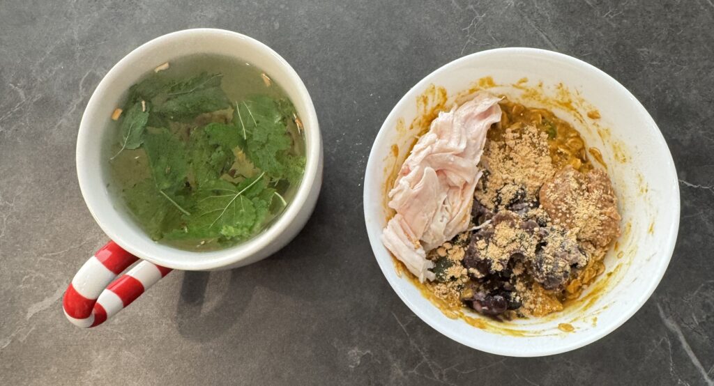 ささみ35g/オートミール35g/かぼちゃ39g/発酵黒豆25g/アーモンドバター10g/豆乳ヨーグルト60g/ハチミツ小さじ1と1/2/きなこ小さじ1