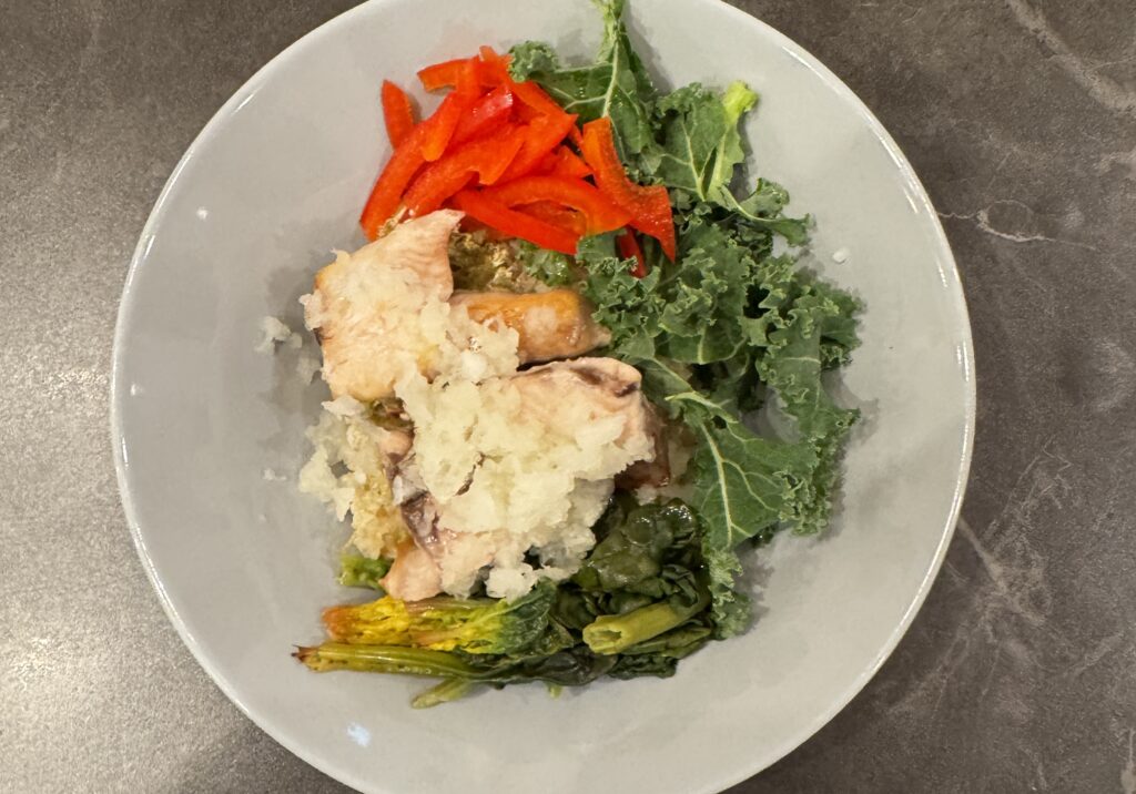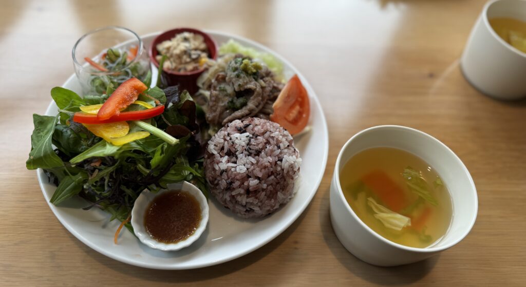 大根おろし30g /玄米150g/パプリカ20g/ケール10g/なめことわかめの味噌汁/ほうれん草21g/